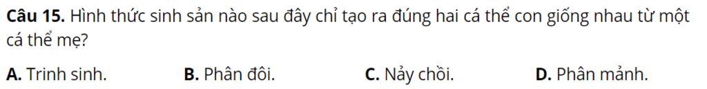 Hình thức sinh sản nào sau đây chỉ tạo ra đúng hai cá thể con giống nhau từ một cá thể mẹ?