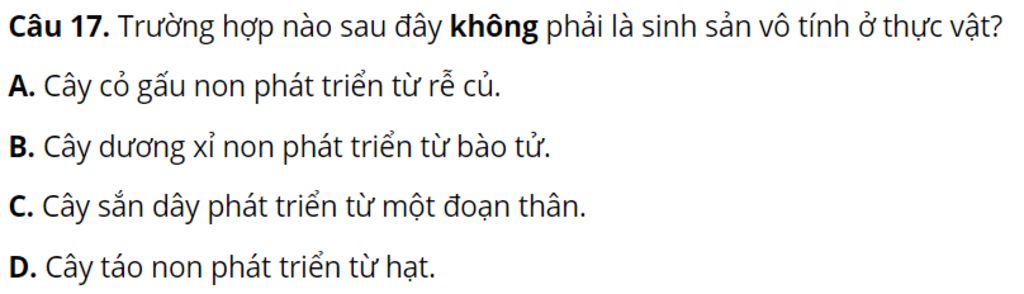 Câu 17. Trường hợp nào sau đây không phải là sinh sản vô tính ở thực vật?