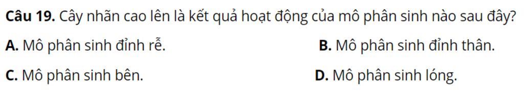 Câu `19:` Cây nhãn cao lên là kết quả hoạt động của mô phân sinh nào sau đây?