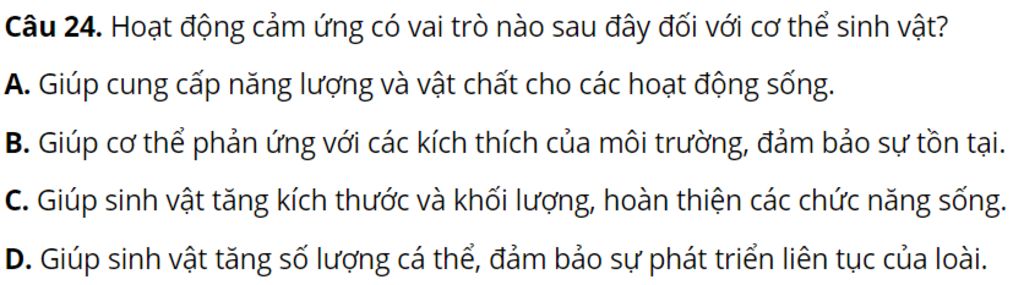 Câu 24. Hoạt động cảm ứng có vai trò nào sau đây đối với cơ thể sinh vật?