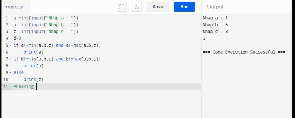 a = int(input("Nhập số thứ nhất: "))b = int(input("Nhập số thứ hai: "))c = int(input("Nhập số thứ ba: "))if a == b or a == c or b == c: print("Không tồn tại số thỏa mãn")else: l = [a,b,c] l.sort() print("Số thỏa mãn:", l[1])