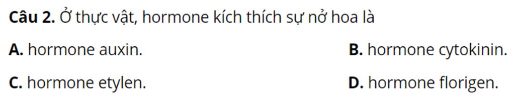 `-` Florigen là phân tử giả thuyết giống như hormone và chịu trách nhiệm kiểm soát và/hoặc kích thích sự ra hoa ở thực vật.