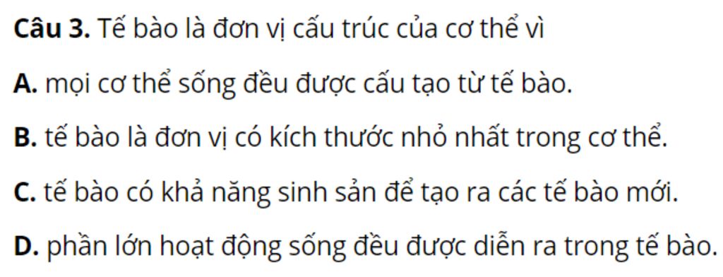 Câu `3`. Tế bào là đơn vị cấu trúc của cơ thể vì