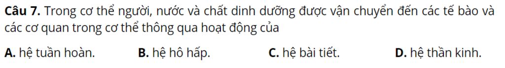 `@`Trong cơ thể người, nước và chất dinh dưỡng được vận chuyển đến các tế bào và các cơ quan trong cơ thể thông qua hoạt động của hệ tuần hoàn