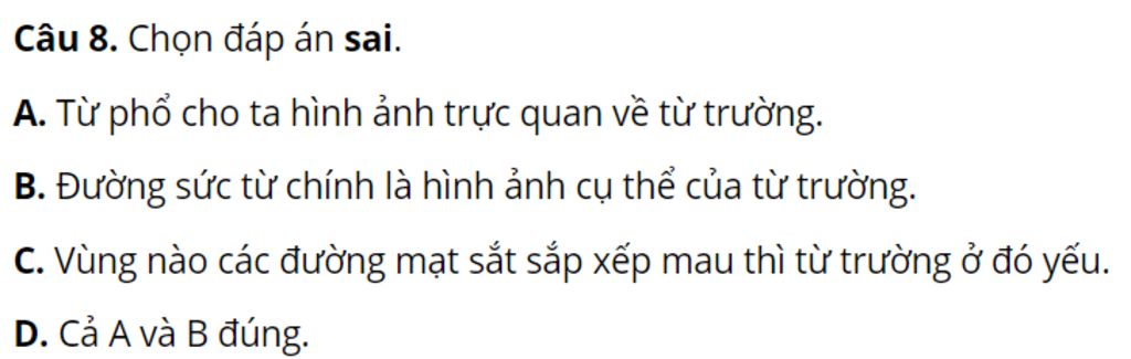 `@`Vùng nào các đường mạt sắt sắp xếp mau thì từ trường ở đó yếu là sai vì các đường mạt sắt sắp xếp càng gần nhau và càng đồng nhất, từ trường sẽ càng mạnh do vậy vùng nào các đường mạt sắt sắp xếp mau thì từ trường ở đó mạnh hơn, không phải yếu hơn.
