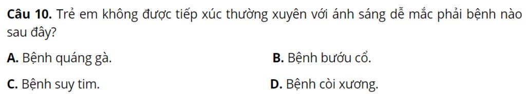 Câu 10. Trẻ em không được tiếp xúc thường xuyên với ánh sáng dễ mắc phải bệnh nào sau đây?