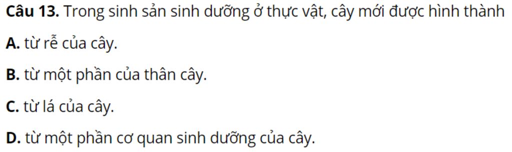 `-` Giải thích : Vì sinh sản sinh dưỡng là hình thức sinh sản trong đó cơ thể mới được hình thành từ một phần cơ quan sinh sưỡng của cơ thể mẹ
