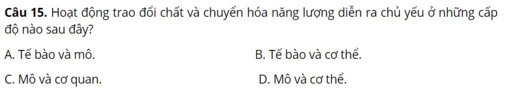 `-` Hoạt động trao đổi chất và chuyển hóa năng lượng diễn ra chủ yếu ở cấp độ tế bào.