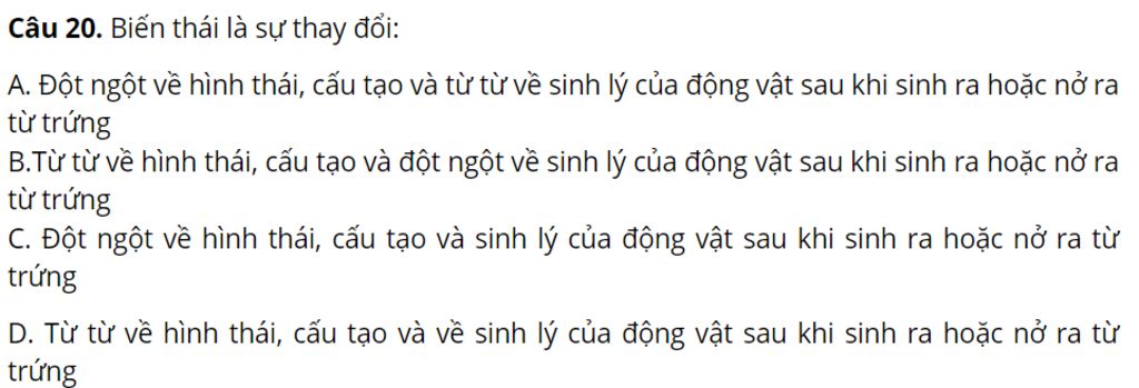 `-` Biến thái là sự thay đổi đột ngột về hình thái, cấu tạo và sinh lý của động vật sau khi sinh ra hoặc nở từ trứng ra.