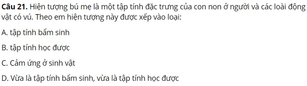 Hiện tượng bú mẹ là một tập tính đặc trưng của con non ở người và các loài động vật có vú. Theo em hiện tượng này được xếp vào loại: