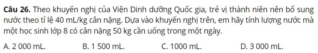 `@`Số lượng nước cần uống của học sinh lớp `8` với cân nặng `50kg` trong `1` ngày là: