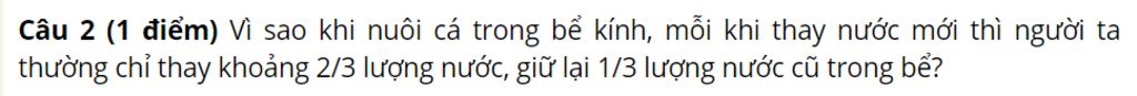 Vì sao khi nuôi cá trong bể kính, mỗi khi thay nước mới thì người ta thường chỉ thay khoảng 2/3 lượng nước, giữ lại 1/3 lượng nước cũ trong bể?
