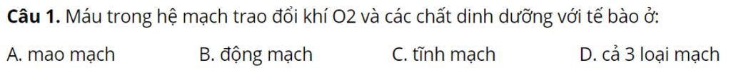 `=>`Mao mạch là nơi mà quá trình trao đổi chất diễn ra giữa máu và các tế bào, bao gồm trao đổi khí `(O_2` và `CO_2)`, chất dinh dưỡng và các chất khác