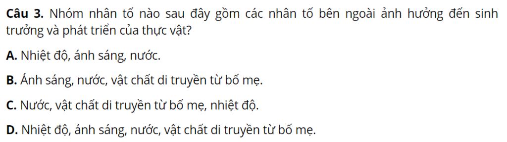 `-` Giải thích : Vì nhiệt độ, ánh sáng, nước gồm các nhân tố bên ngoài ảnh hưởng đến sinh trưởng và phát triển của thực vật.