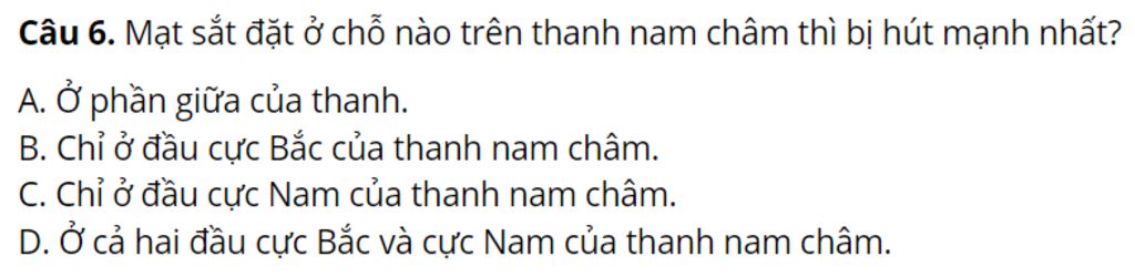 `-` Giải thích : Vì mạt sắt được đặt ở cả hai đầu cực Bắc và cực Nam của thanh nam châm thì bị hút mạnh nhất.