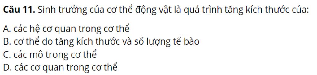 Câu 11. Sinh trưởng của cơ thể động vật là quá trình tăng kích thước của: