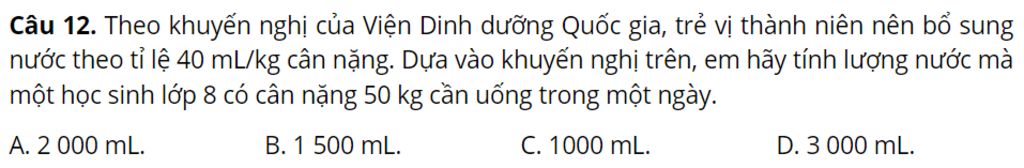 Câu 12. Theo khuyến nghị của Viện Dinh dưỡng Quốc gia, trẻ vị thành niên nên bổ sung nước theo tỉ lệ 40 mL/kg cân nặng. Dựa vào khuyến nghị trên, em hãy tính lượng nước mà một học sinh lớp 8 có cân nặng 50 kg cần uống trong một ngày.
