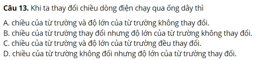`-` Giải thích : Vì thay đổi chiều dòng điện chạy qua ống dây thì chiều của từ trường thay đổi nhưng độ lớn của từ trường không thay đổi