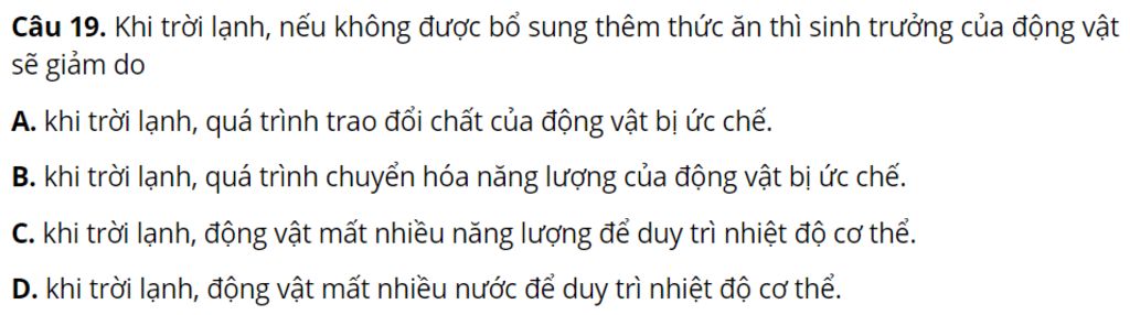 Câu 19. Khi trời lạnh, nếu không được bổ sung thêm thức ăn thì sinh trưởng của động vật sẽ giảm do