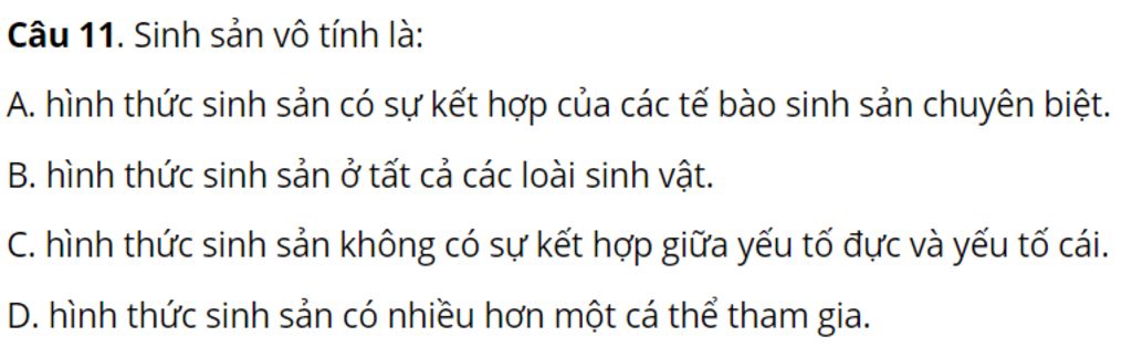 `@`Sinh sản vô tính là hình thức sinh sản không có sự kết hợp giữa yếu tố đực và yếu tố cái. Sinh vật tự sinh sản mà không cần giao phối với sinh vật khác