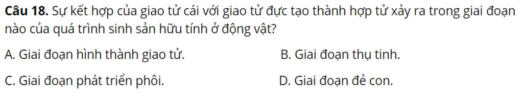 Câu 18. Sự kết hợp của giao tử cái với giao tử đực tạo thành hợp tử xảy ra trong giai đoạn nào của quá trình sinh sản hữu tính ở động vật?