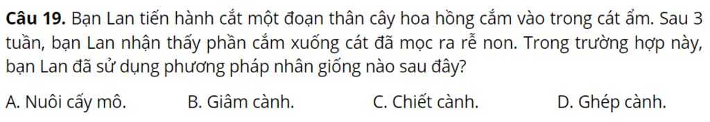 Câu `19:` Bạn Lan tiến hành cắt một đoạn thân cây hoa hồng cắm vào trong cát ẩm. Sau `3` tuần, bạn Lan nhận thấy phần cắm xuống cát đã mọc ra rễ non. Trong trường hợp này, bạn Lan đã sử dụng phương pháp nhân giống nào sau đây?