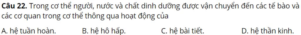 `@`Hệ tuần hoàn có vai trò vận chuyển máu, chất dinh dưỡng và oxy đến các tế bào và cơ quan trong cơ thể, cũng như loại bỏ các sản phẩm phụ của sự trao đổi chất