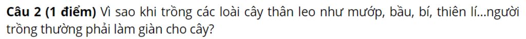 `@` Các loại cây như mướp , bầu , bí , thiên lí , ... thuộc loại cây leo nên khi trồng phải tạo giàn cho cây để chúng có thể tiếp xúc với ánh nắng