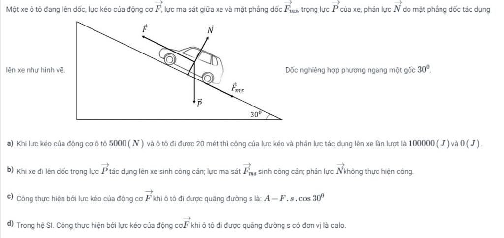 d) Trong hệ Sĩ. Công thực hiện bởi lực kéo của động cơ F khi ô tô đi được quãng đường 5 có đơn vị là calo