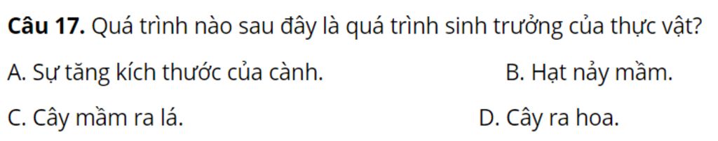Câu `17`. Quá trình nào sau đây là quá trình sinh trưởng của thực vật?