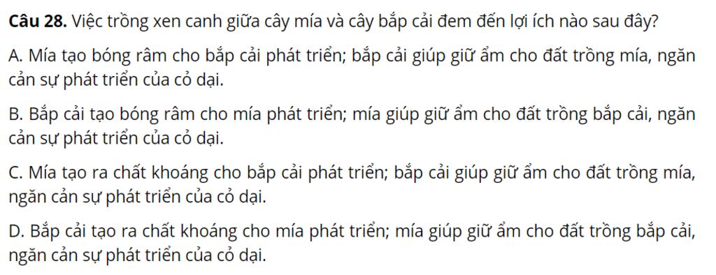 Câu 28. Việc trồng xen canh giữa cây mía và cây bắp cải đem đến lợi ích nào sau đây?