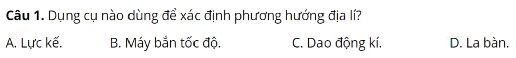 `@`Dụng cụ nào dùng để xác định phương hướng địa lí là la bàn, nó hoạt động thông qua từ tính trên Trái Đất