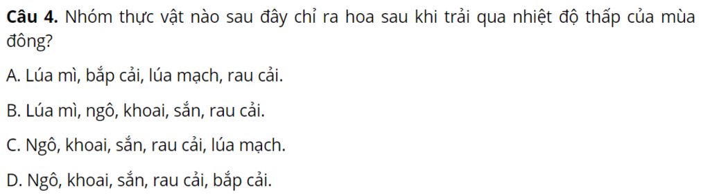 Câu `4`. Nhóm thực vật nào sau đây chỉ ra hoa sau khi trải qua nhiệt độ thấp của mùa đông?