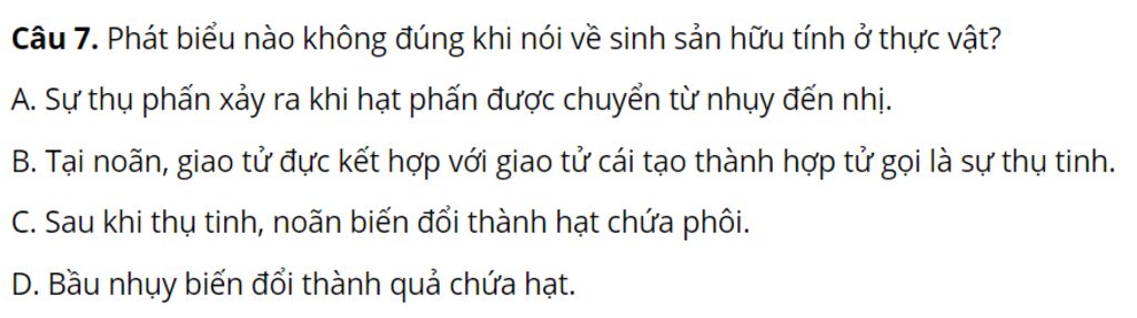 Sau khi thụ tinh ,noãn biến đổi thành hạt chứa phôi là không đúng khi nói về sinh sản hữu tính ở thực vật