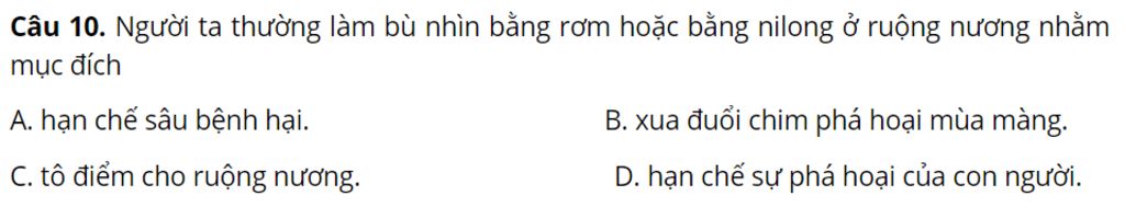 `@`Người ta thường sử dụng rơm hoặc nilon để tạo ra các âm nhạc gió để xua đuổi chim phá hoại mùa màng, giúp bảo vệ mùa màng khỏi sự tổn thất do chim ăn quả trên cây trồng