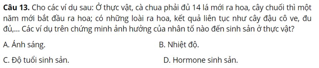 `-` Cho các ví dụ sau: Ở thực vật, cà chua phải đủ 14 lá mới ra hoa, cây chuối thì một năm mới bắt đầu ra hoa; có những loài ra hoa, kết quả liên tục như cây đậu cô ve, đu đủ,… các ví dụ trên chứng minh ảnh hường đến từ độ tuổi sinh sản ở thực vật do chúng bị già, yếu so với tuổi non, tươi nên việc sinh sản ở thực vật rất khó khăn