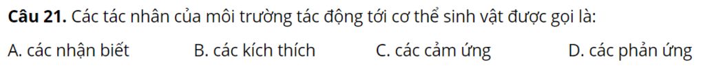 `@`Các tác nhân của môi trường tác động tới cơ thể sinh vật được gọi là các kích thích vì chúng làm cho cơ thể sinh vật phản ứng lại để thích ứng với điều kiện môi trường xung quanh