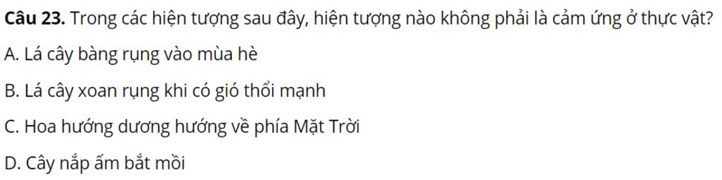 Câu 23. Trong các hiện tượng sau đây, hiện tượng nào không phải là cảm ứng ở thực vật?