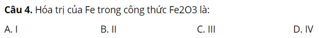 Vậy hóa trị của `Fe` trong công thức `Fe_2 O_3` là `III`
