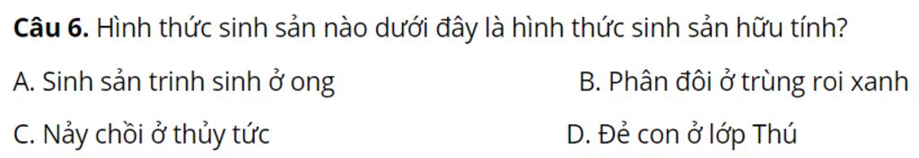 `-` Giải thích : Vì Hình thức sinh sản hữu tính là đẻ con ở lớp Thú. Sinh sản trinh sinh ở ong, nảy chồi ở thủy tức,....