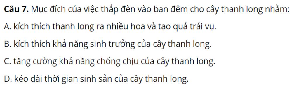 `-` Mục đích của việc thắp đèn vào ban đêm cho cây thanh long nhằm kích thích thanh long ra nhiều hoa và tạo quả trái vụ
