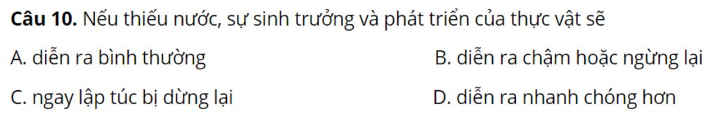`@`Thực vật cần nước để thực hiện các quá trình sinh trưởng như: quang hợp, vận chuyển chất dinh dưỡng, và duy trì cấu trúc của tế bào. Thiếu nước có thể làm giảm tốc độ sinh trưởng và phát triển của thực vật