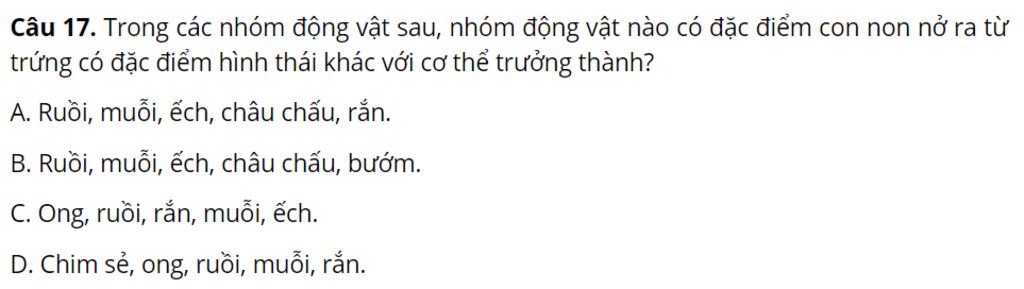 Câu 17. Trong các nhóm động vật sau, nhóm động vật nào có đặc điểm con non nở ra từ trứng có đặc điểm hình thái khác với cơ thể trưởng thành?