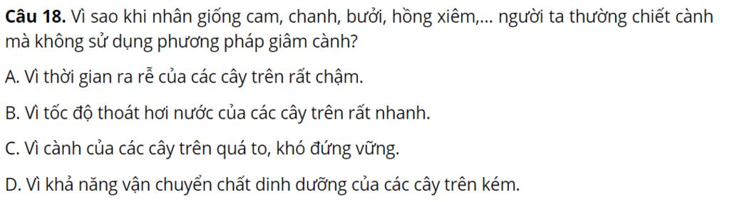 `-` Giải thích : Vì đó là những cây ra rễ chậm nên nếu sử dụng phương pháp giâm cành thì cành thường bị chết do thiếu nước và chất khoáng.