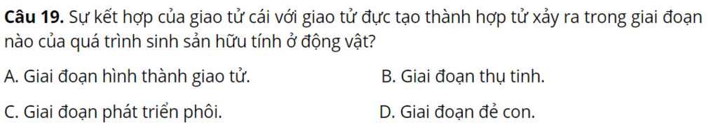Câu `19`. Sự kết hợp của giao tử cái với giao tử đực tạo thành hợp tử xảy ra trong giai đoạn nào của quá trình sinh sản hữu tính ở động vật?