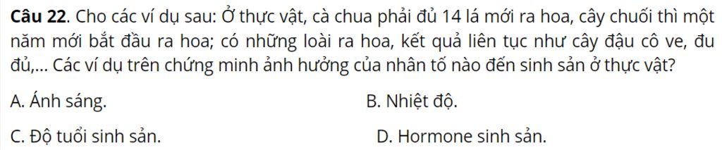 Ở thực vật, cà chua phải đủ `14` lá mới ra hoa, cây chuối thì một năm mới bắt đầu ra hoa; có những loài ra hoa, kết quả liên tục như cây đậu cô ve, đu đủ, `…` Các ví dụ trên chứng minh ảnh hưởng của nhân tố nào đến sinh sản ở thực vật `?`