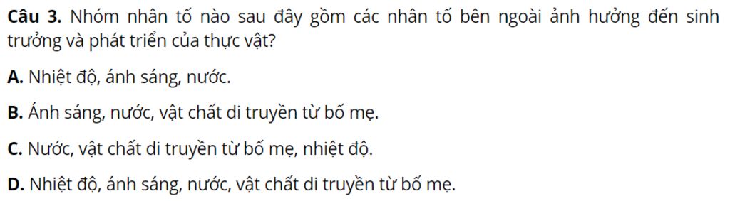 `-`Giải thích : Vì nhiệt độ, ánh sáng, nước là các nhân tố bên ngoài ảnh hưởng đến sinh trưởng và phát triển của thực vật.