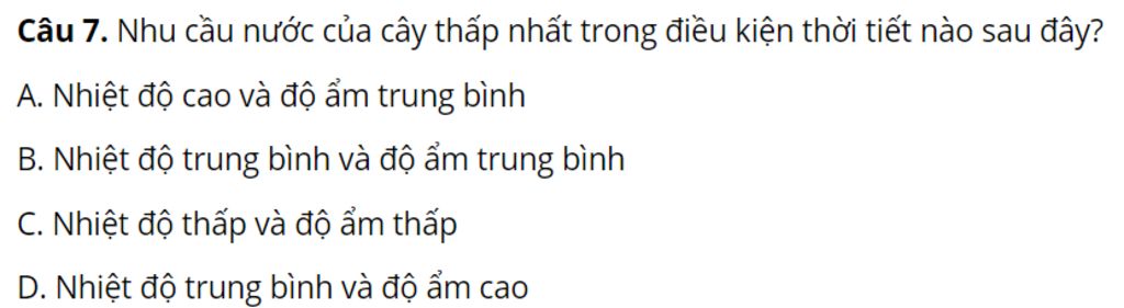 `to` Nhu cầu nước của cây thấp nhất trong điều kiện thời tiết