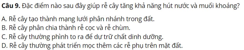 Câu `9`. Đặc điểm nào sau đây giúp rễ cây tăng khả năng hút nước và muối khoáng?