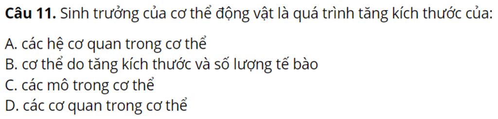 `-` Giải thích : Vì sinh trưởng của cơ thể động vật là quá trình tăng kích thước của cơ thể do tăng kích thước và số lượng tế bào.